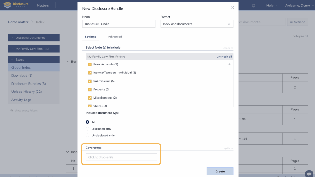 During bundle creation, include the affidavit document in the “Cover Page” section.